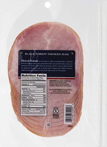 Dietz & Watson Pre-Sliced Black Forest Ham. Why make a plain old boring ham sandwich when you can make a Black Forest Ham sandwich? This traditional family recipe ham is slow-smoked with hickory for an artisan Black Forest flavor. A premium, hand-trimmed North American pork variety that is the star of any sandwich. Sliced and packaged into a resealable bag for your convenience. Like all Dietz & Watson products it has no hormones and is gluten free.